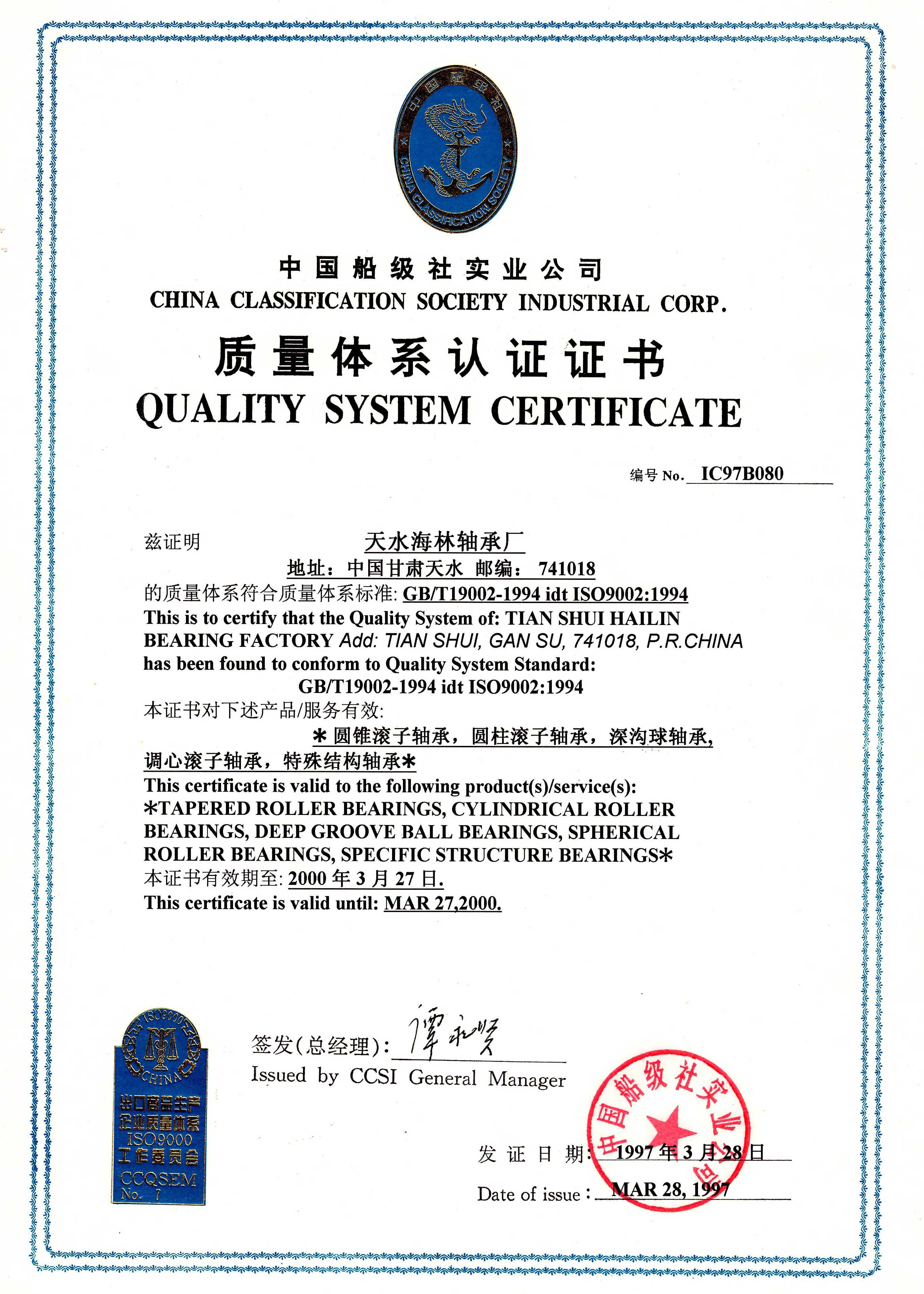 HL passed CCS quality certification center ISO9002:1994